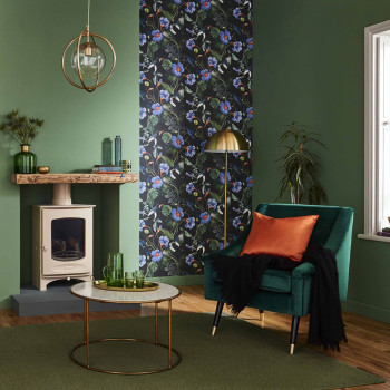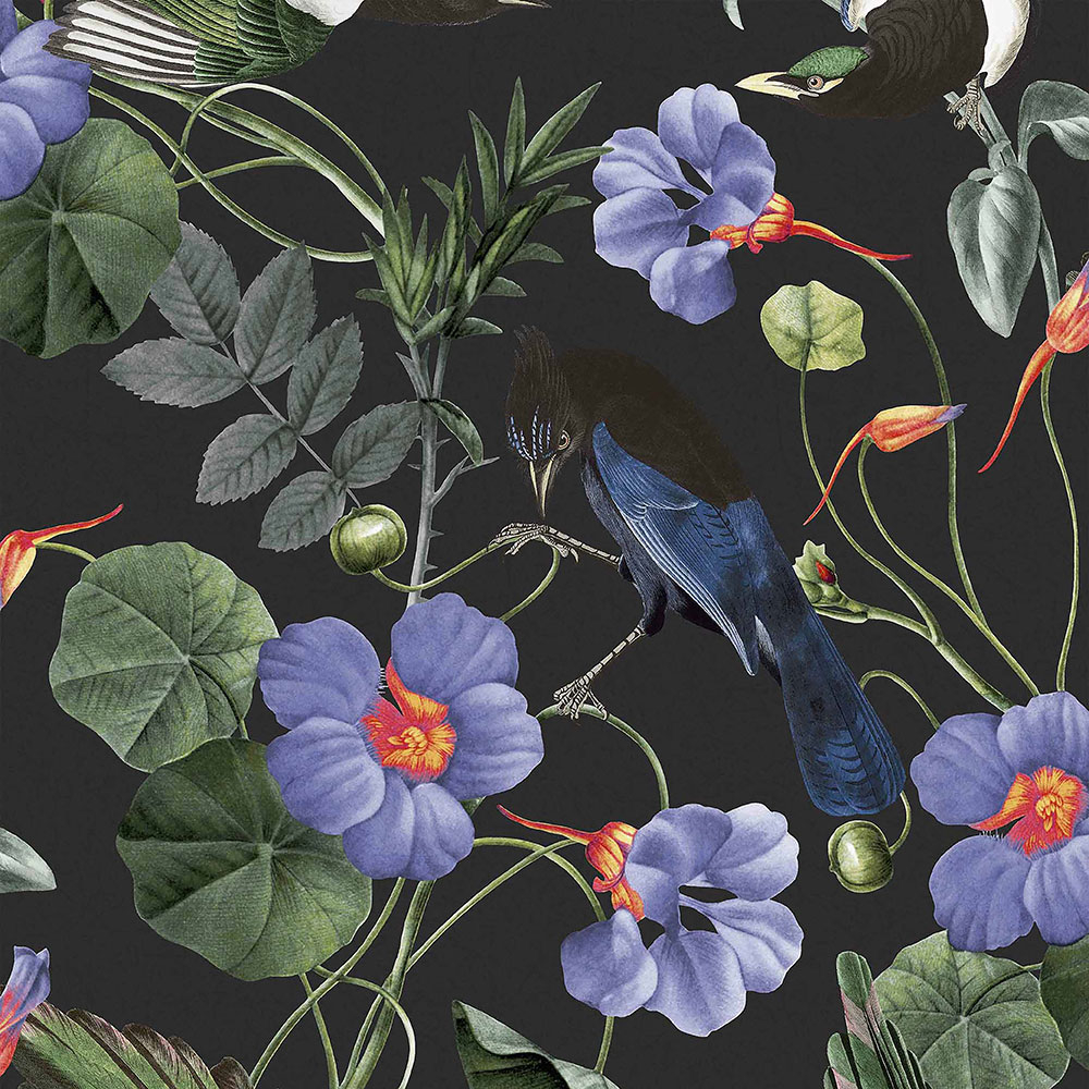 Luxusní vliesová tapeta s motivem exotických ptáků, listů, květů v zelených, modrých, oranžových odstínech na černém hladkém podkladu.