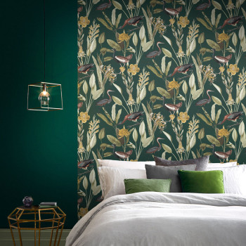 Luxusní vliesová tapeta s motivem volavek, listů, květů v zelených, modrých, růžových a béžových odstínech na tmavě zeleném hladkém podkladu.