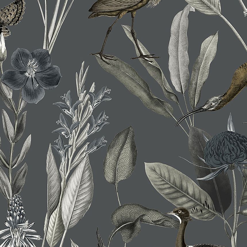 Luxusní vliesová tapeta s motivem volavek, listů, květů v šedých a hnědých odstínech na šedém hladkém podkladu.