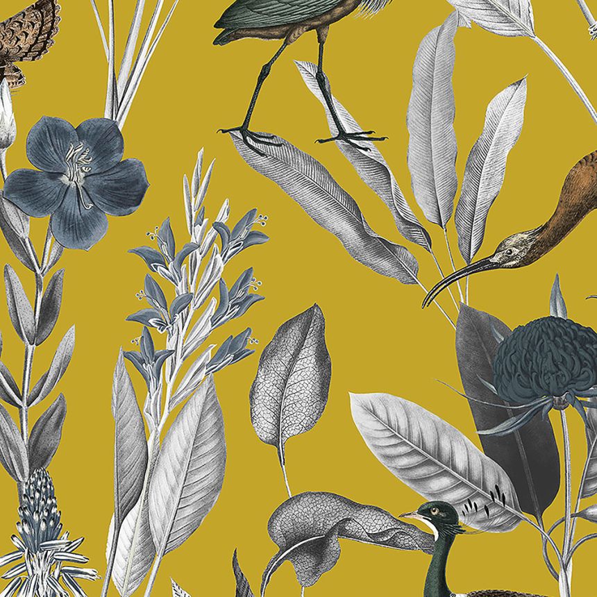 Luxusní vliesová tapeta s motivem volavek, listů a květů v šedé barvě na okrovém hladkém podkladu.
