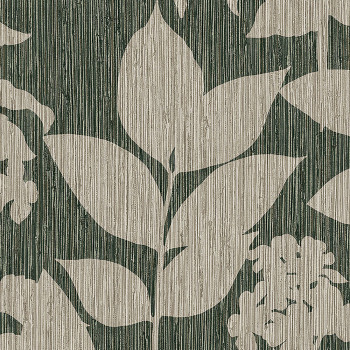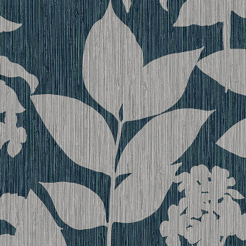 Jemná žíhaná vliesová tapeta s motivem velkých šedých listů na tyrkysovém podkladu se zelenými proužky.
