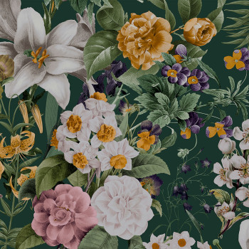 Květinová vliesová tapeta v sytých odstínech zelené, oranžové a růžové na tmavě zeleném podkladu.