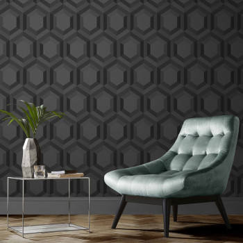 Jemná vliesová tapeta se tmavě šedými hexagony na šedém texturovaném pozadí.