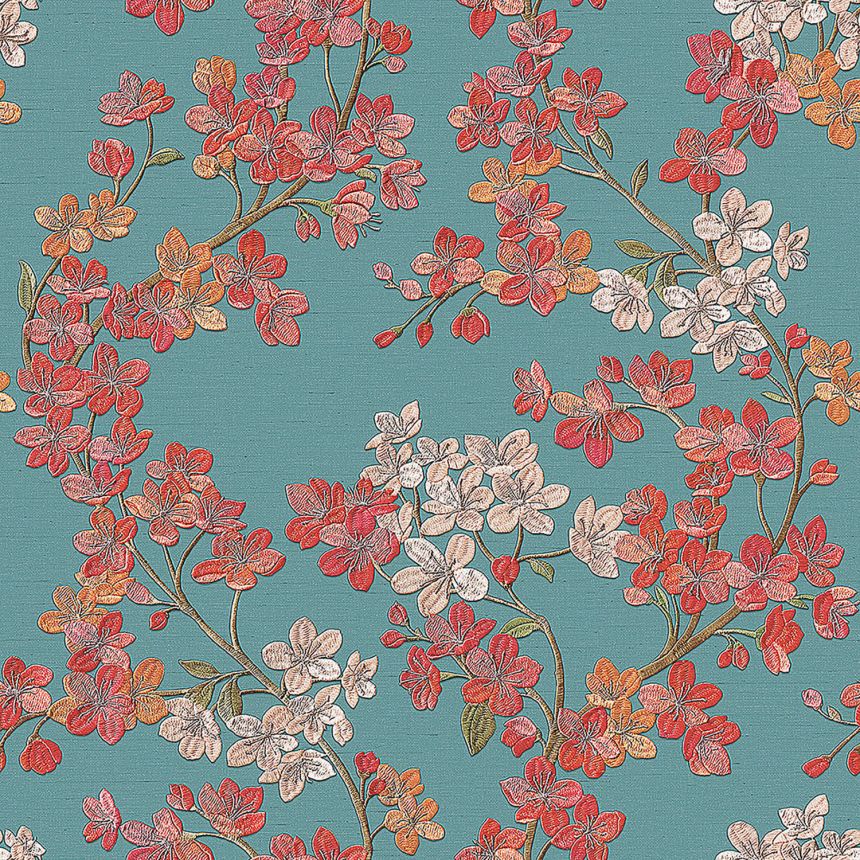 Luxusní tyrkysová vliesová tapeta na zeď - květinový vzor s metalickým leskem v odstínech červené a terakota, podklad imitace jemné textilie. Luxusní tapeta vhodná do obývacího pokoje, nebo ložnice.