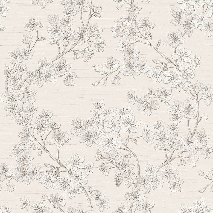 Luxusní krémová vliesová tapeta na zeď - květinový vzor s metalickým leskem, podklad imitace jemné textilie. Luxusní tapeta vhodná do obývacího pokoje, nebo ložnice.