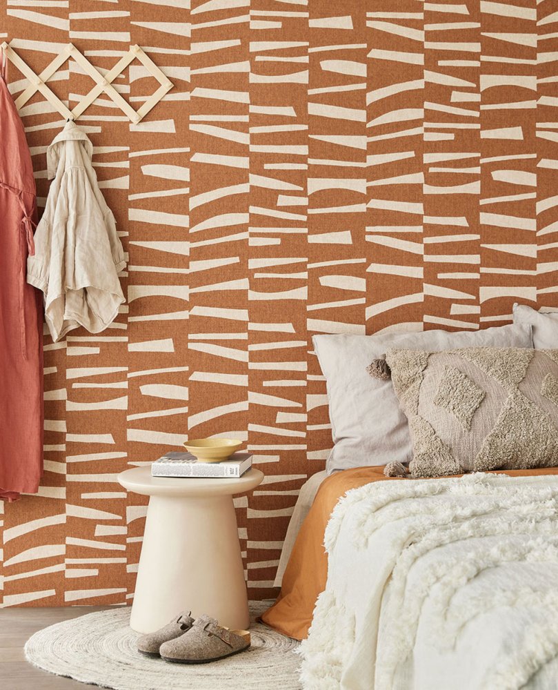 Vliesová tapeta na zeď, retro geometrický vzor, odstíny hnědé / terakota a béžové. Tapeta vhodá do ložnice, obýváku i pracovny.