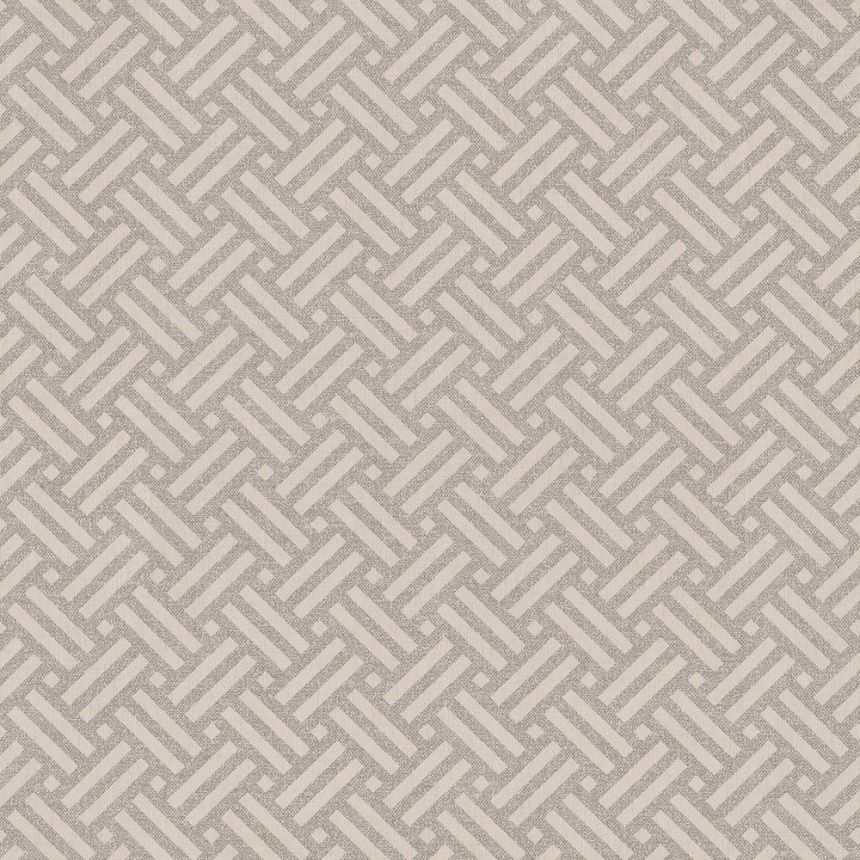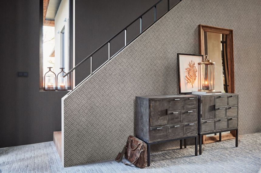 Béžová vliesová tapeta na zeď, imitace jemné textilie s šedo-hnědým proplétaným vzorem. Tapeta je vhodná do obývacího pokoje, ložnice, chodby, nebo pracovny.