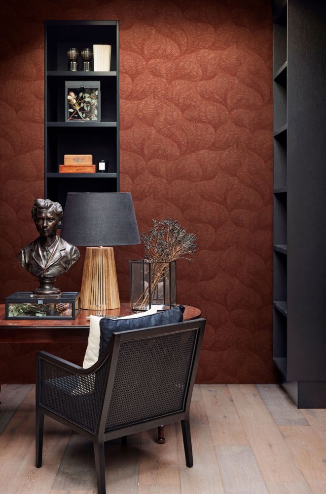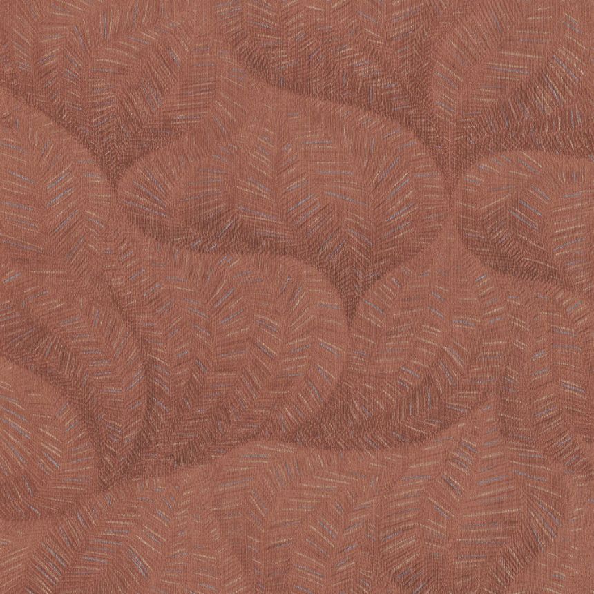 Cihlově červená vliesová tapeta na zeď, vzor stylizovaných listů s metalickými zlatými a stříbrnými detaily. Tapeta je vhodná do obývacího pokoje, ložnice, nebo pracovny.