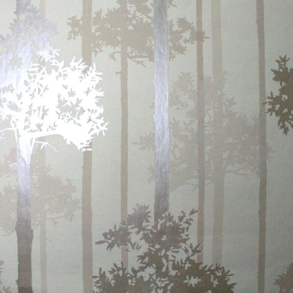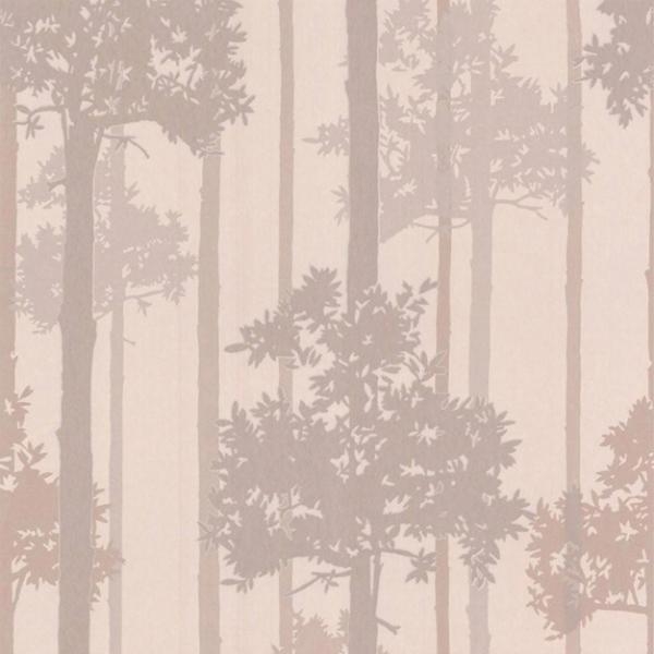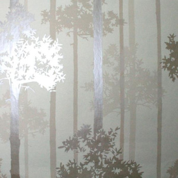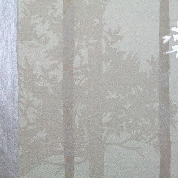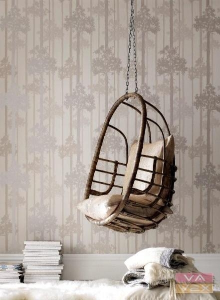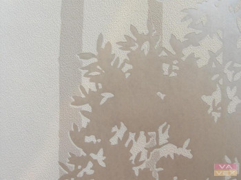 Vliesová tapeta se vzorem, smetanový podklad, béžové stromy, jemný lesk.