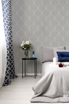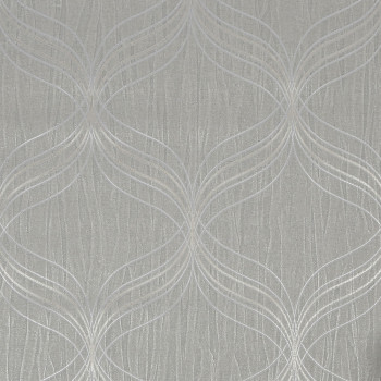Luxusní vliesová tapeta s mačkanou strukturou a jemným stříbrným a zlatým ornamentem na světle šedém podkladu.