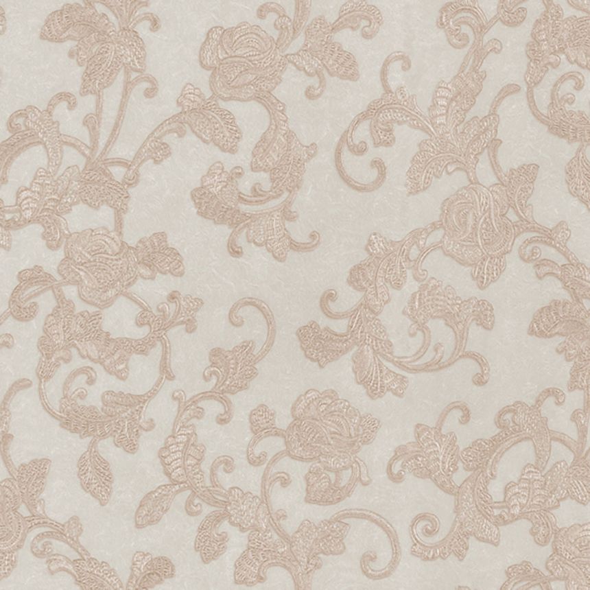Šíře role 1,06m. Krémová luxusní plastická vliesová tapeta na zeď - vinylový povrch, béžový zámecký ornamentální vzor se zlatými třpytkami.