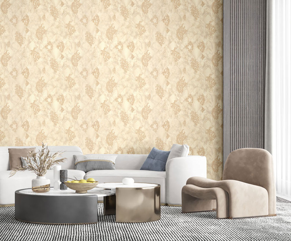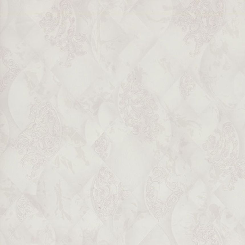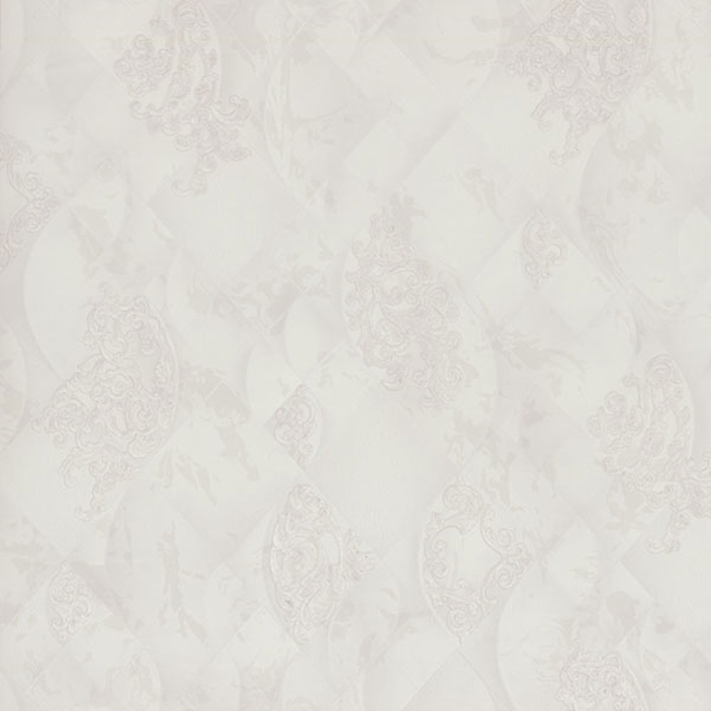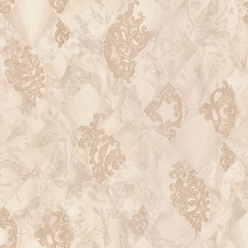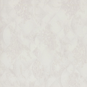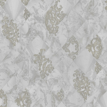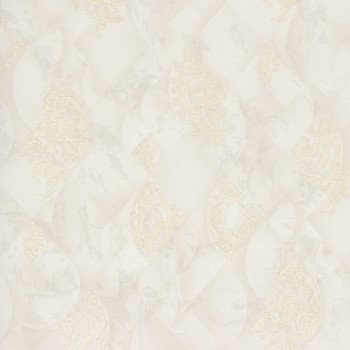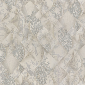 Šíře role 1,06m. Luxusní plastická vliesová tapeta na zeď - vinylový povrch, smetanový geometrický mramorovaný podklad s perlovám leskem, zámecký ornamentální vzor se stříbrnými třpytkami.