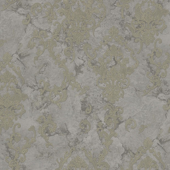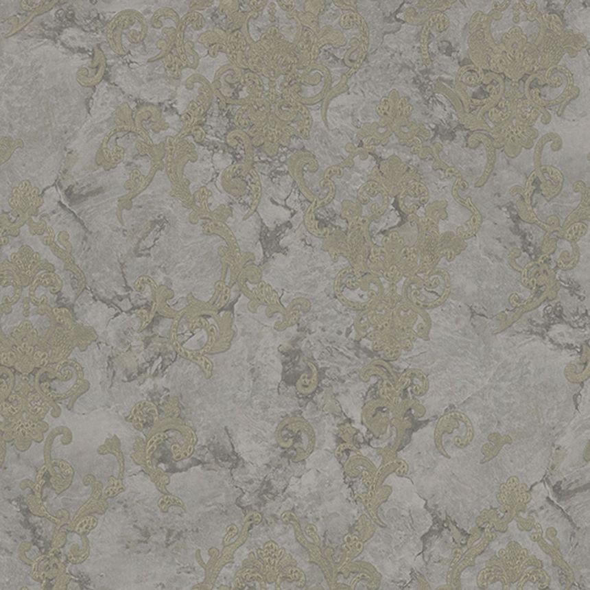 Šíře role 1,06m. Šedá luxusní plastická vliesová tapeta na zeď - vinylový povrch, zlatý zámecký ornamentální vzor, zlaté třpytky.