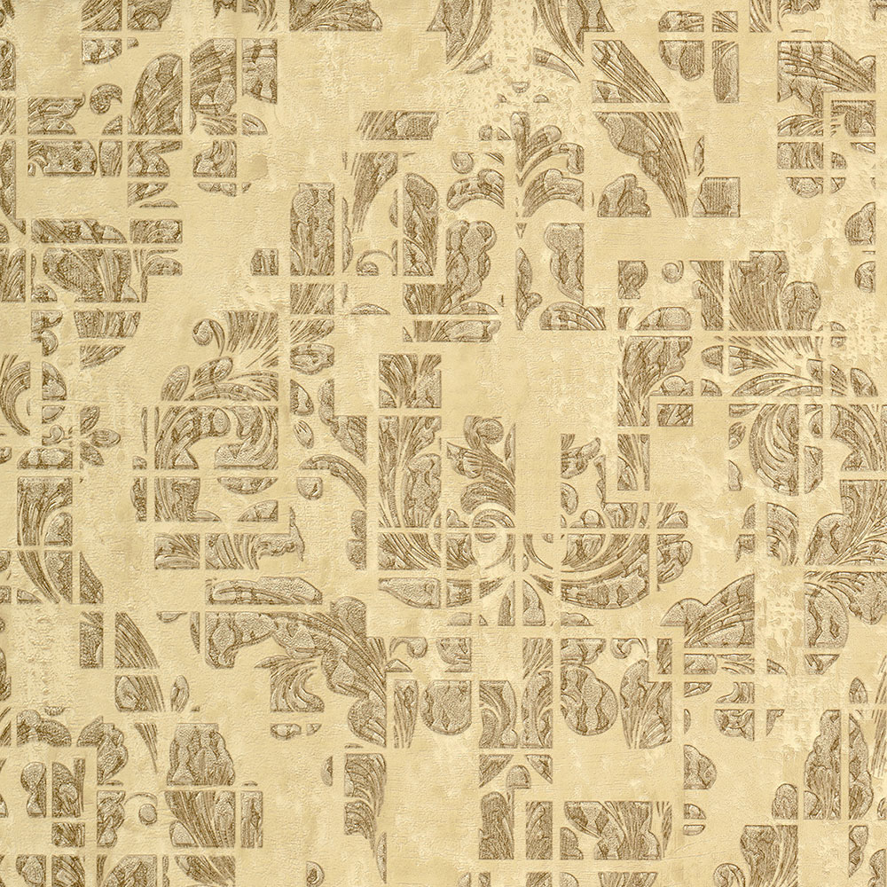 • Obrazy klasických vzorů získávají tvar, i když jsou roztříštěné a vytváří tak jedinečné vzory na tapetách, které jsou umístěné na podkladu s moderními strukturami.