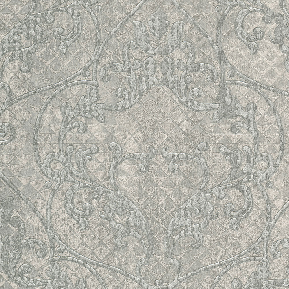 Vliesová tapeta na zeď s vinylovým povrchem se zámeckým ornamentálním vzorem v šedých a modrých odstínech.