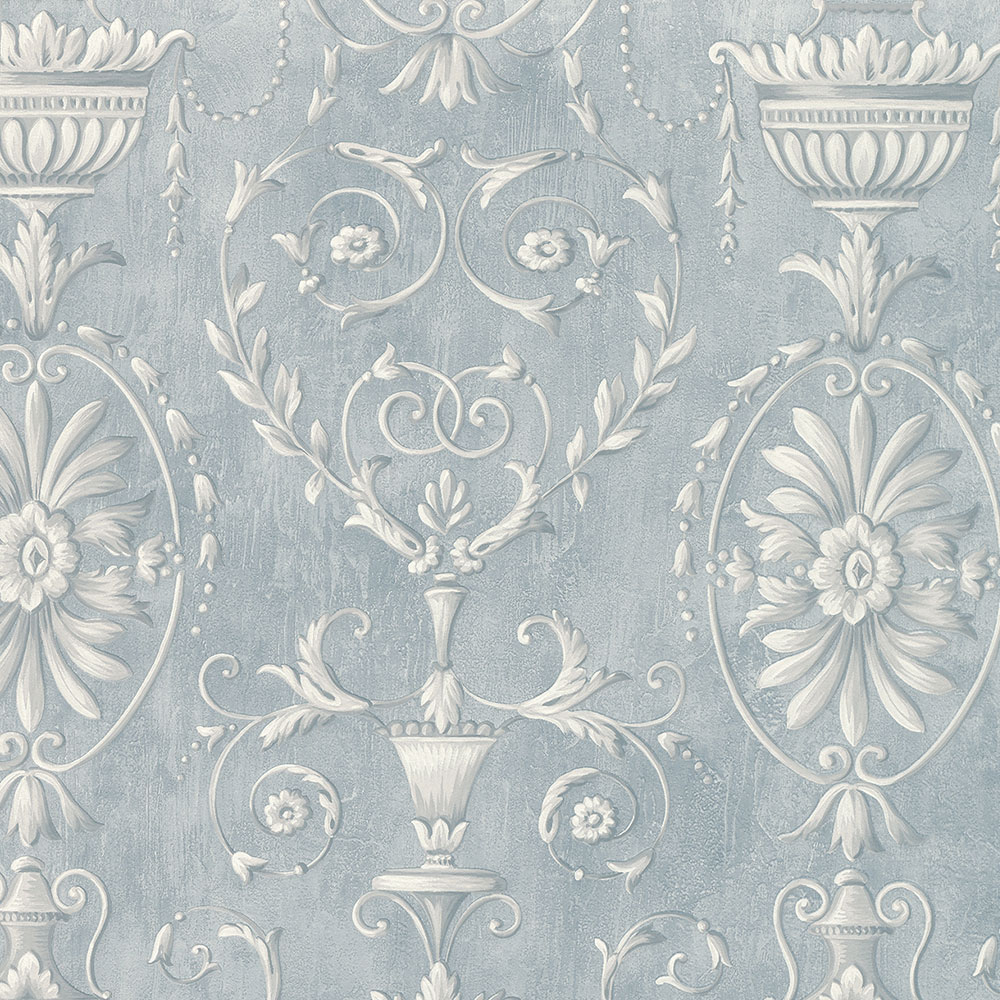 Luxusní vliesová tapeta se zámeckými ornamenty květin a váz na hrubém šedo modrém štukovém podkladu.