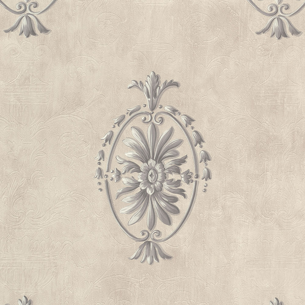 Luxusní vliesová tapeta s šedými zámeckými ornamenty květin na hrubém béžovém štukovém podkladu.