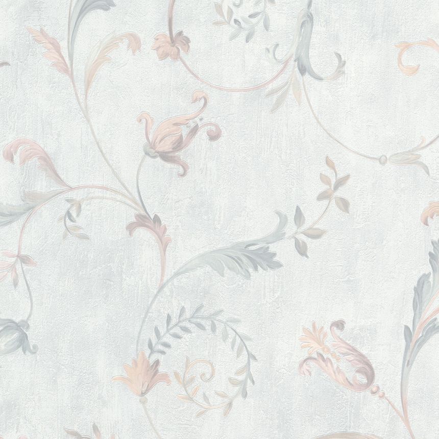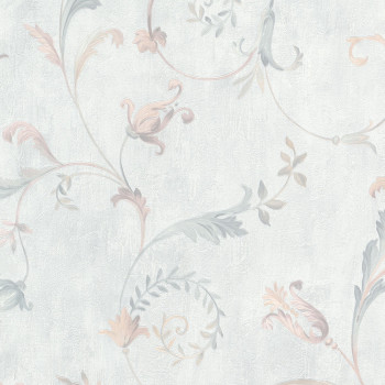 Luxusní vliesová tapeta s rostlinnými ornamenty na jemném štukovém podkladu ve světle šedé barvě.