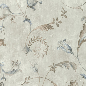Luxusní vliesová tapeta s rostlinnými ornamenty na jemném štukovém podkladu ve světle šedé barvě.