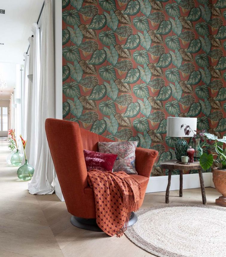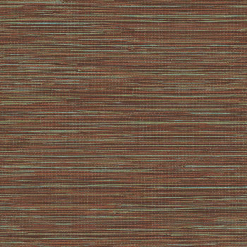 Vliesová tapeta s výraznou textilní strukturou s hnědými, cihlově červenými a tyrkysovými pruhy.