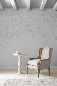 Obrazová vliesová tapeta se šedými větvičkami s lístky na šedém hladkém podkladu vnese do interiéru příjemnou atmosféru.