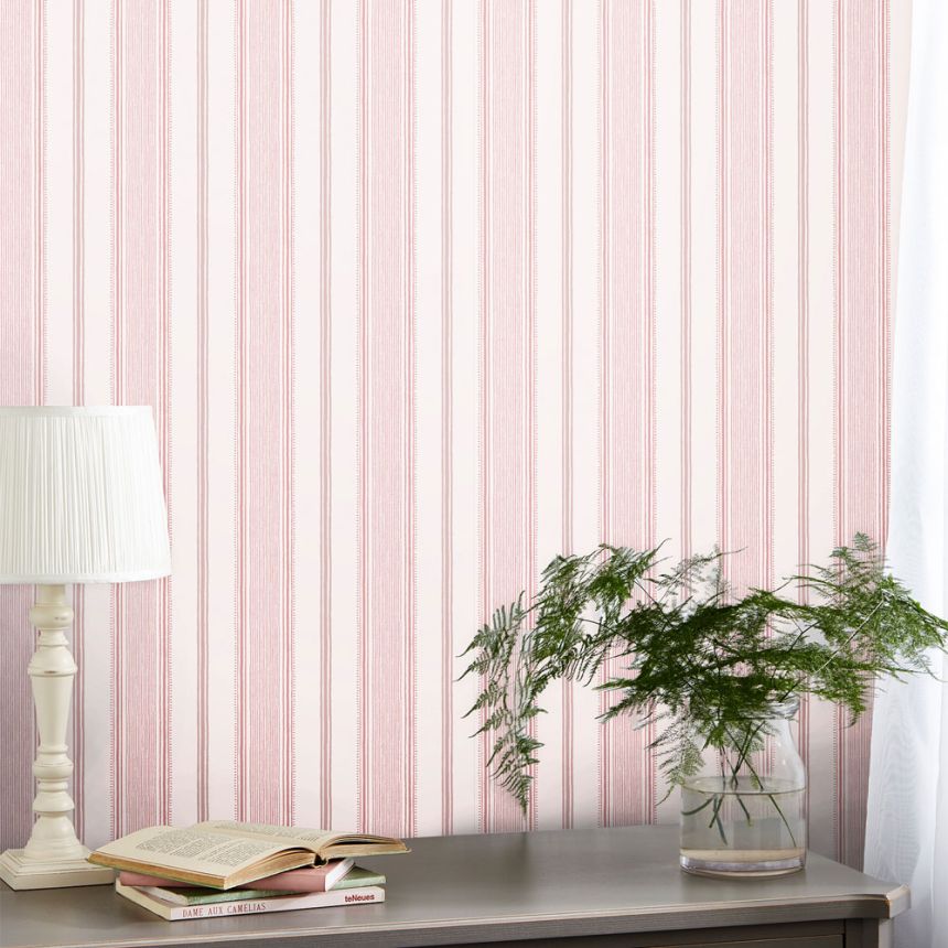 Vliesová tapeta s růžovými pruhy na bílém hladkém podkladu vnese do interiéru příjemnou atmosféru.