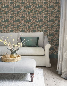 Vliesová tapeta s hnědo béžovými větvičkami na tmavě zeleném hladkém podkladu vnese do interiéru příjemnou atmosféru.