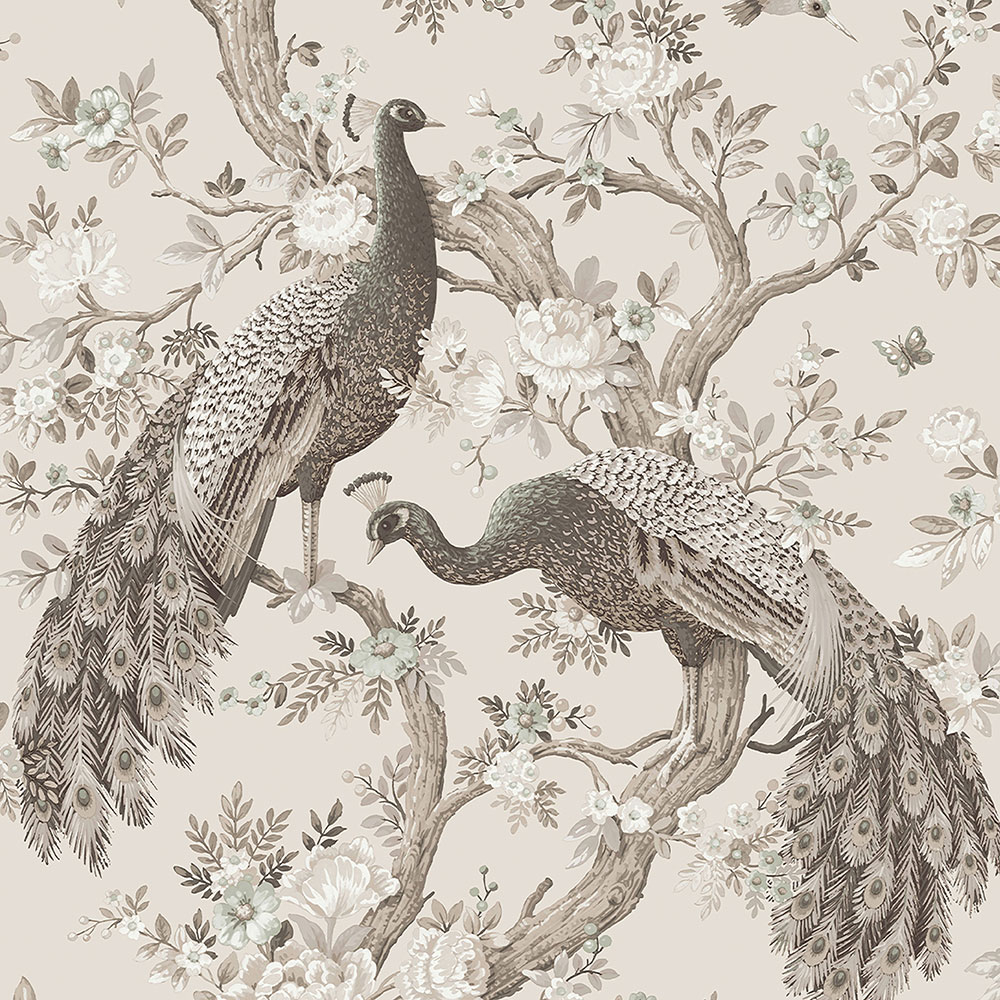 Romantická květinová vliesová tapeta s motivem béžových pivoňkových květů a pávů na krémovém podkladu.