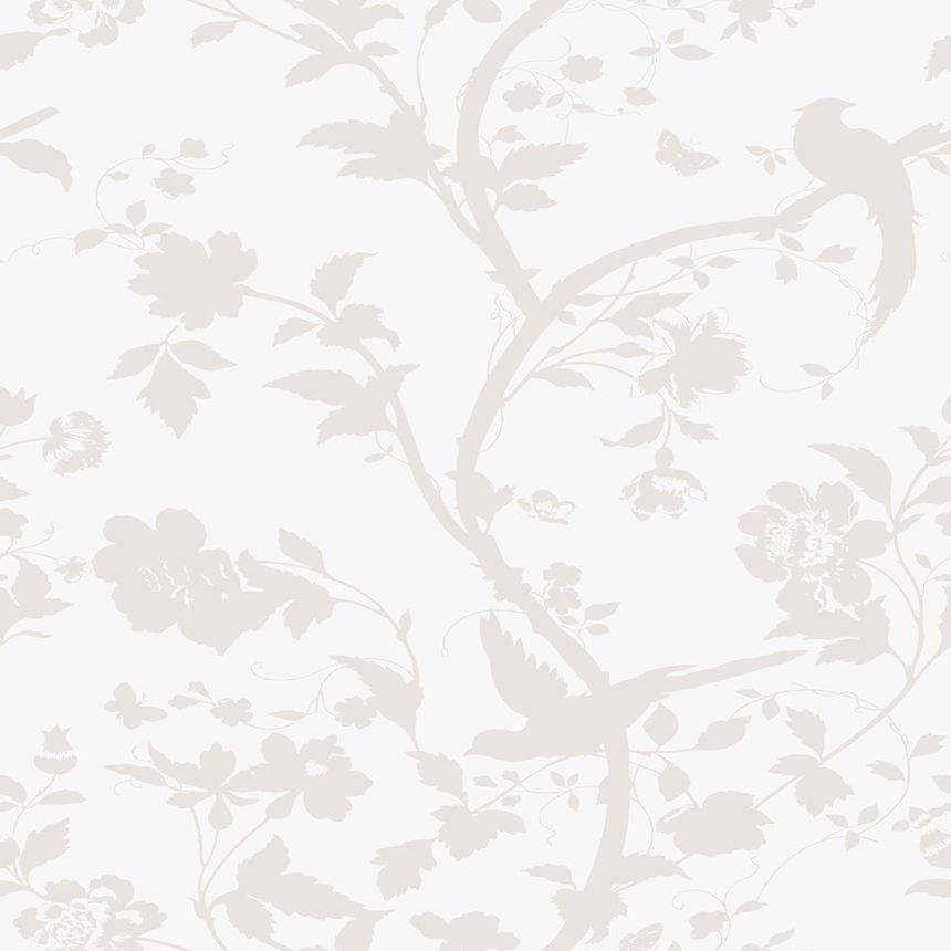 Vliesová tapeta s krémovými metalickými květy a ptáčky na matném bílém hladkém podkladu.
