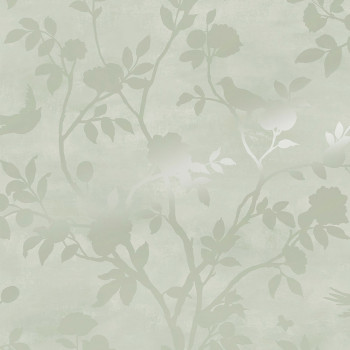 Vliesová tapeta s šedými perleťovými květy a ptáčky na světle zeleném hladkém podkladu vnese do interiéru příjemnou atmosféru.