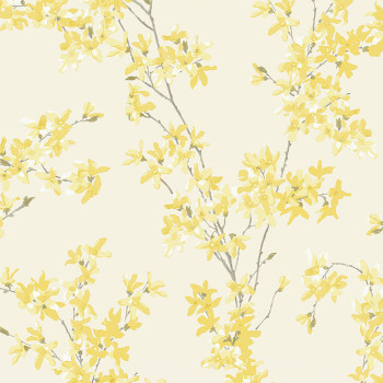 Vliesová tapeta s větvičkami zlatého deště na krémovém hladkém podkladu vnese do interiéru příjemnou atmosféru.
