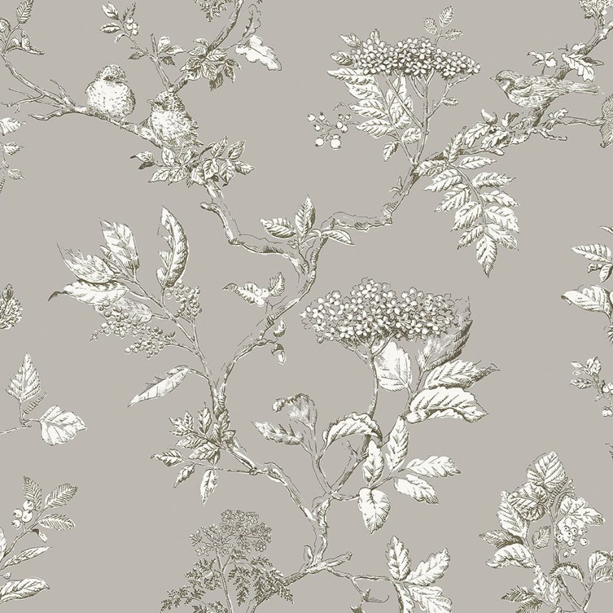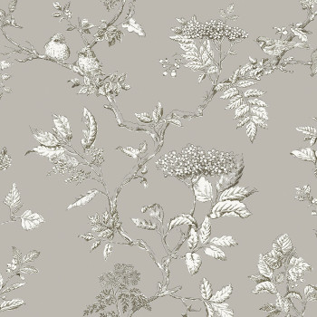 Vliesová tapeta s jeřabinami a ptáčky na světle šedém hladkém podkladu vnese do interiéru příjemnou atmosféru lesa.