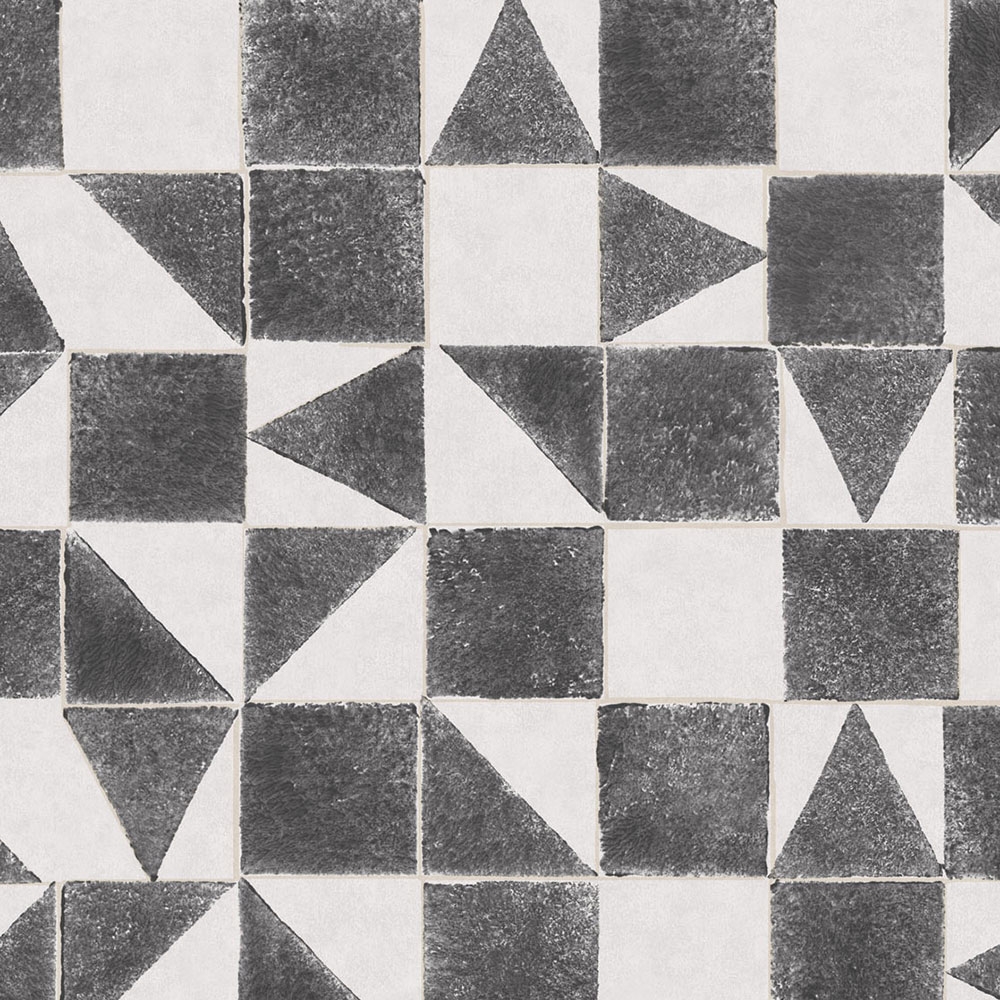 Vliesová, dětská tapeta. Trojúhelníky a čtverce v šedo-černých odstínech, metalické krémové, částečně setřené, obrysy.
