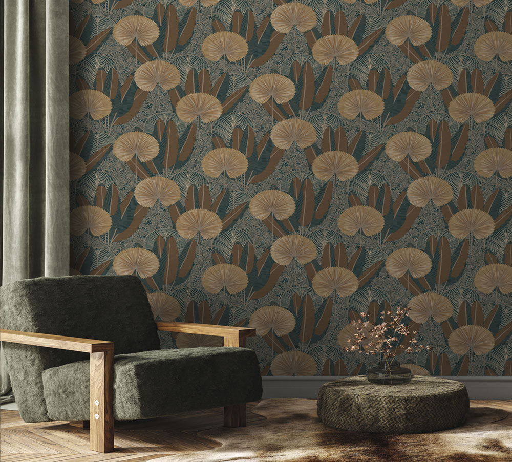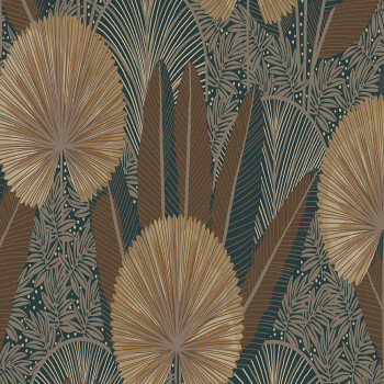 Vliesová tapeta s geometrickým vzorem květin a listů v tmavě zelených a hnědých tónech s metalickými liniemi na strukturovaném podkladu vnese do interiéru příjemnou atmosféru luxusu.
