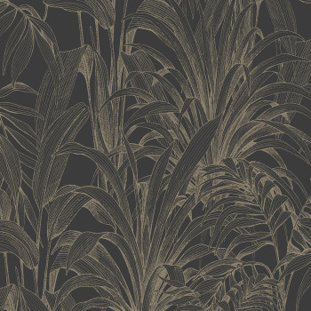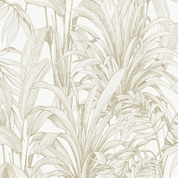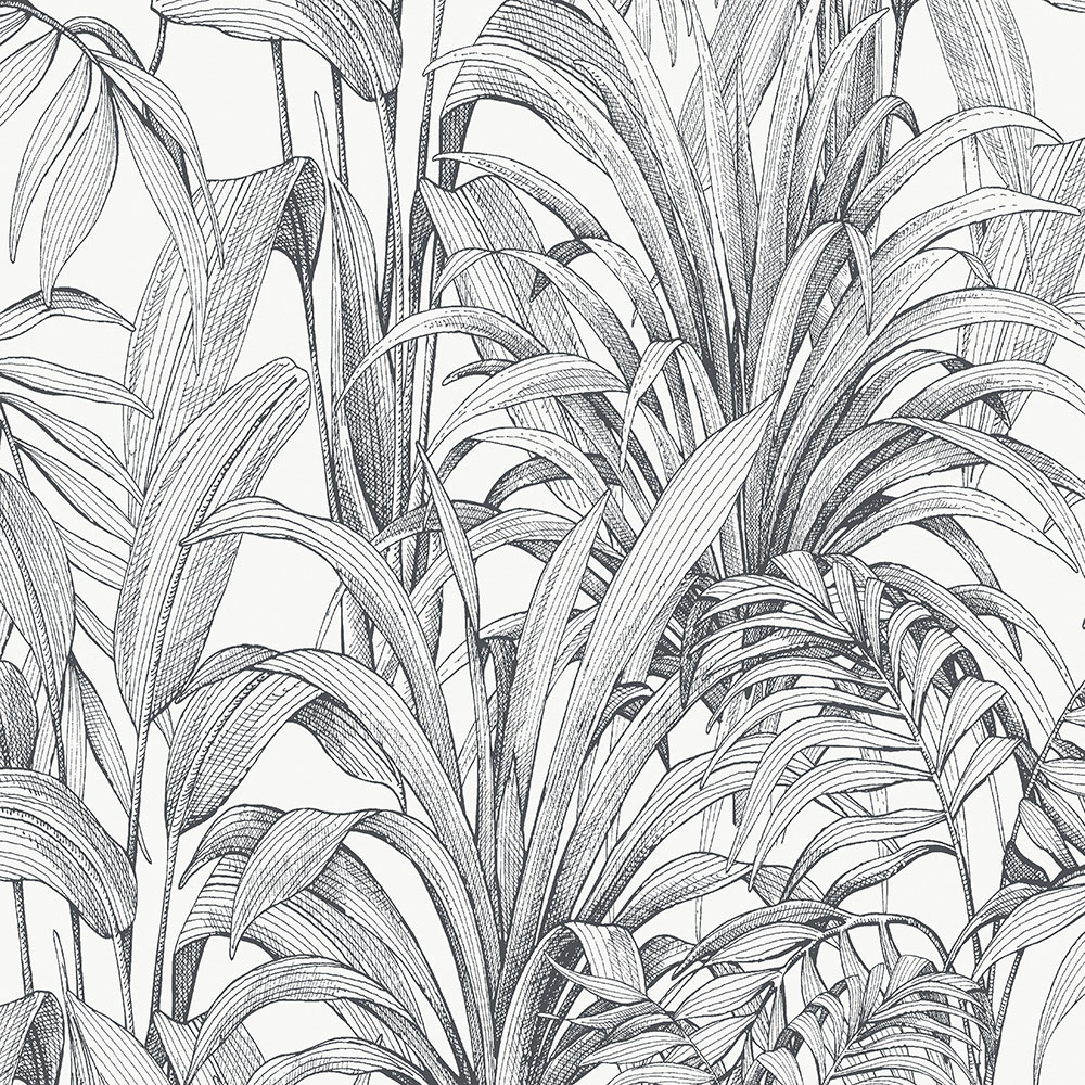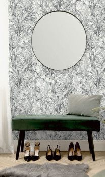 Vliesová tapeta na zeď s černými obrysy listů rostlin na bílém strukturovaném podkladu.