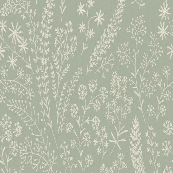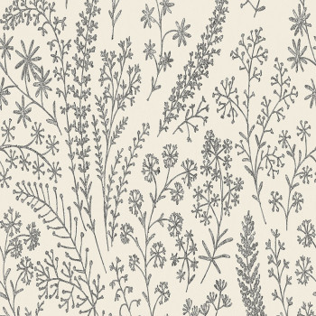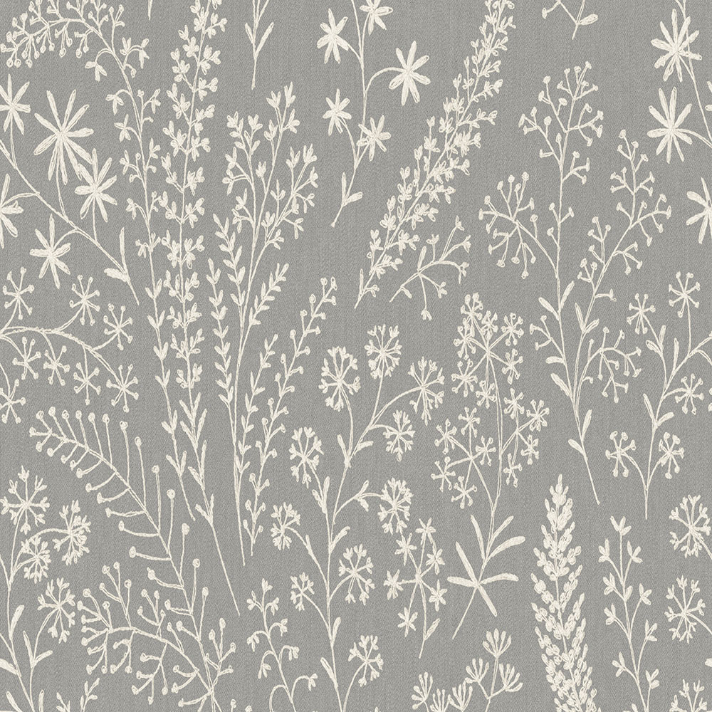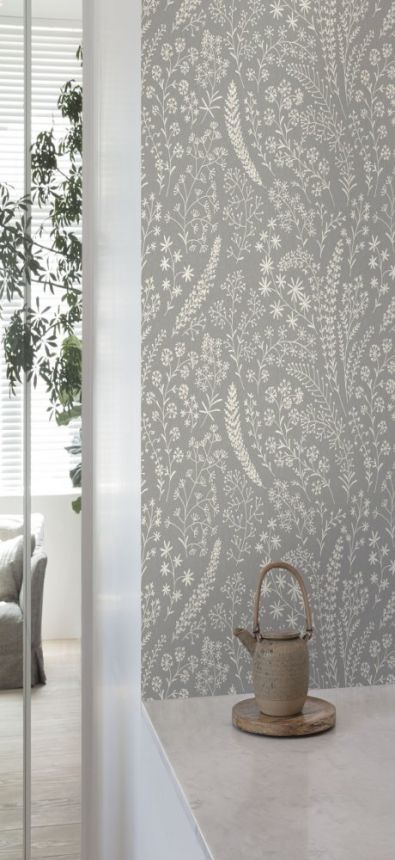 Vliesová tapeta na zeď s bílými obrysy rostlin na šedém strukturovaném podkladu.