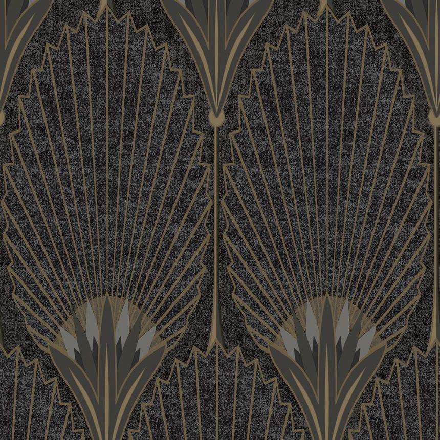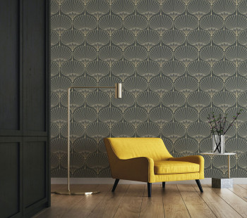 Vliesová tapeta se zlatými geometrickými vzory na strukturovaném černém podkladu vnese do interiéru příjemnou atmosféru luxusu.