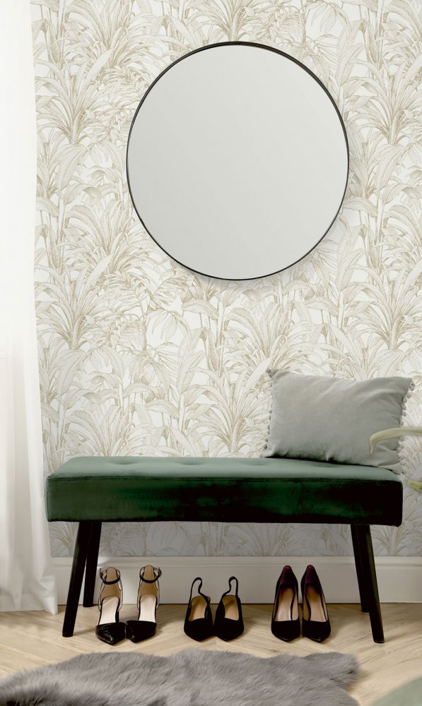Vliesová tapeta na zeď s zlatými obrysy listů rostlin na bílém strukturovaném podkladu.