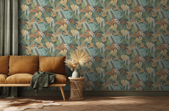 Vliesová tapeta na zeď s barevnými listy na tmavě zeleném podkladu.