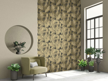 Vliesová tapeta na zeď se zelenými listy palem na tmavě zeleném strukturovaném podkladu.
