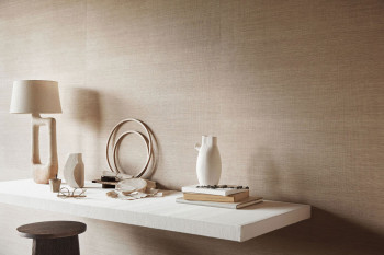Vliesová tapeta na zeď s vinylovým povrchem se vzorem a strukturou jemného dřeva v béžových odstínech.