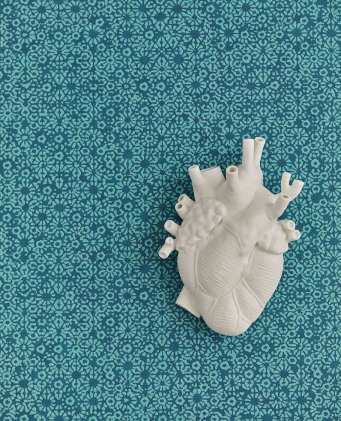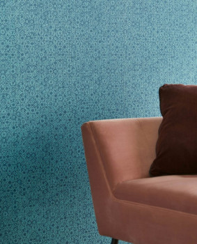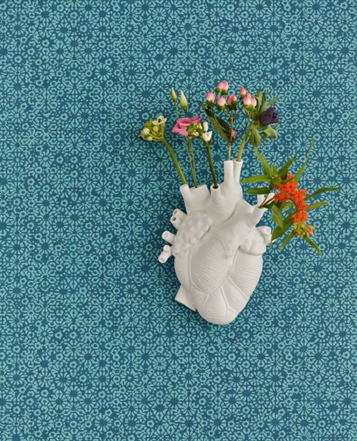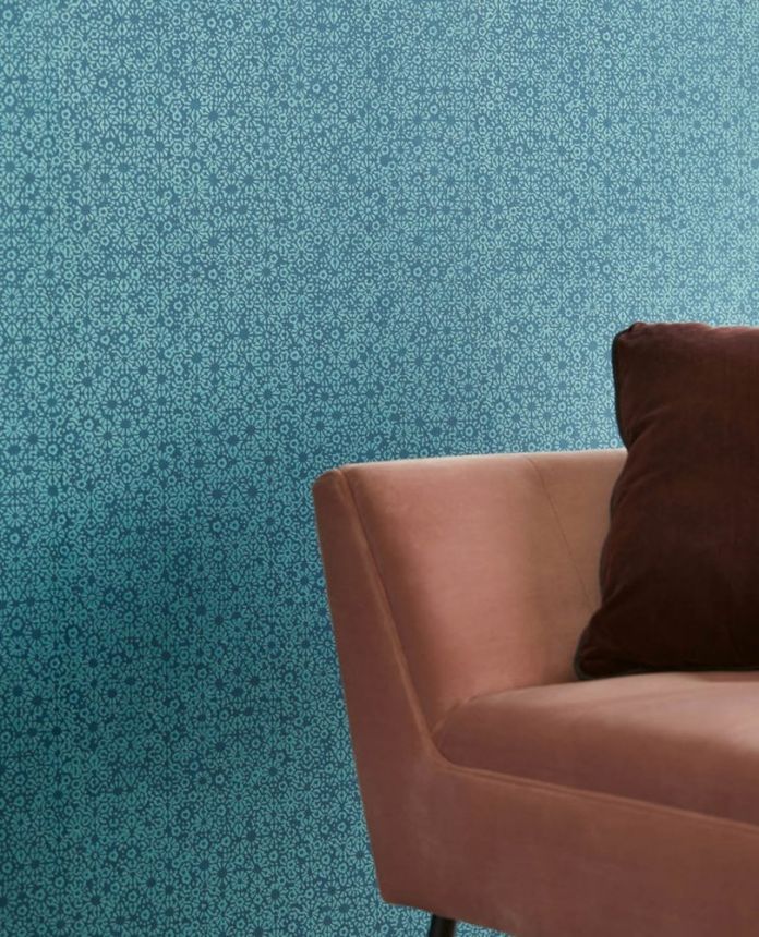 Design jemně plastických růžic. Podklad matný modrý, vzor tyrkysový s jemnými odlesky.Kolekce inspirovaná dílem odvážné, nezávislé a stylové Fridy Kahlo.