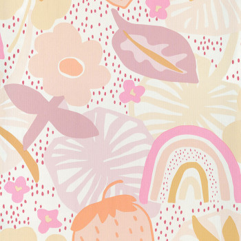 Pestrobarevná dětská vliesová tapeta na zeď - dětská malba, květiny, listy, jahody, duha. Tapeta má látkovou texturu.