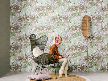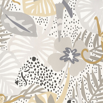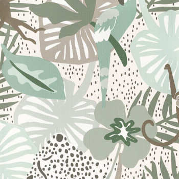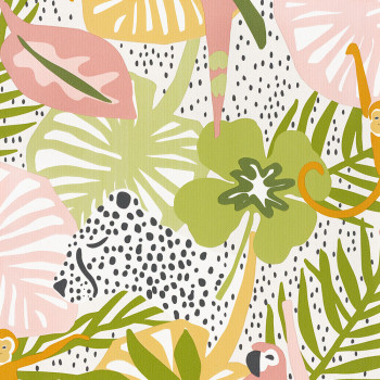 Barevná dětská vliesová tapeta na zeď - listy, opice a papoušci. Tapeta má látkovou texturu.