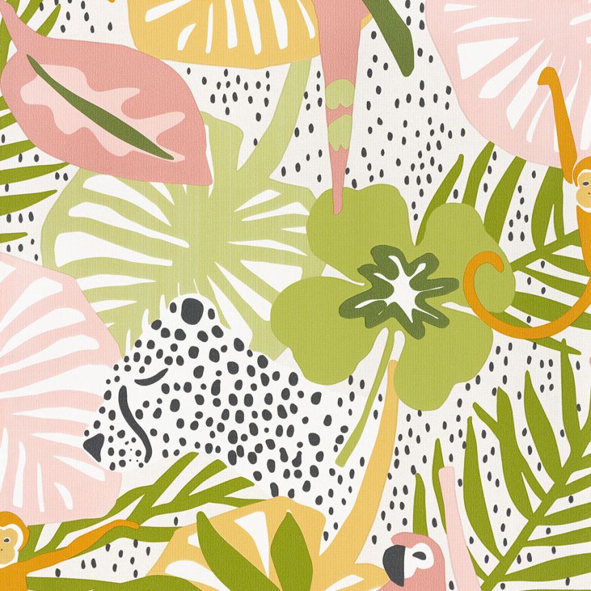 Barevná dětská tapeta s listy, papoušky, opicemi 220721, Doodleedo, BN Walls