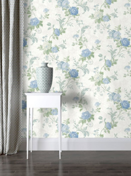 Vliesová tapeta na zeď s vinylovým povrchem v modrých a růžových odstínech s květinovým vzorem.