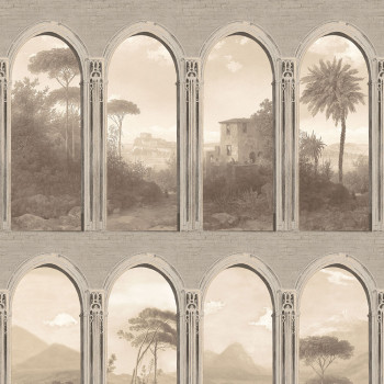 Vliesová tapeta na zeď s vinylovým povrchem v béžových odstínech s jemnými odlesky a vzorem podloubí s krajinou.