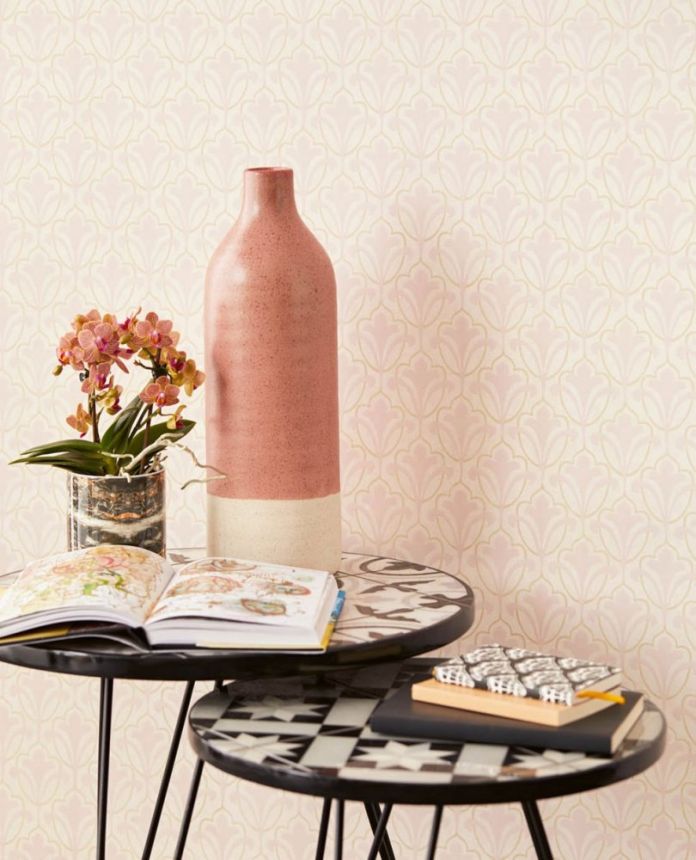 Matná hladká vliesová tapeta s ornamentálním vzorem v odstínech růžové a béžové.Kolekce inspirovaná dílem odvážné, nezávislé a stylové Fridy Kahlo.