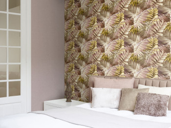 Hnědo-růžová hrubě strukturovaná tapeta s motivy listů palem.
