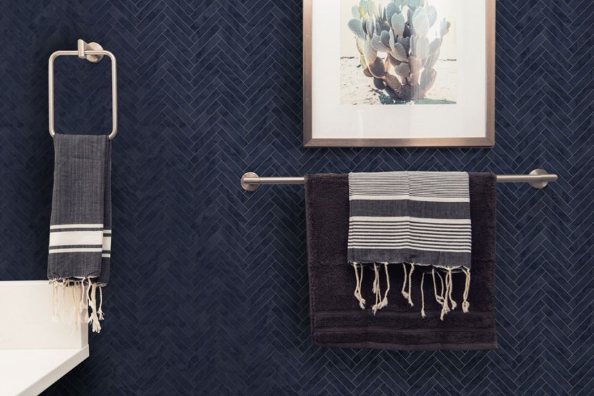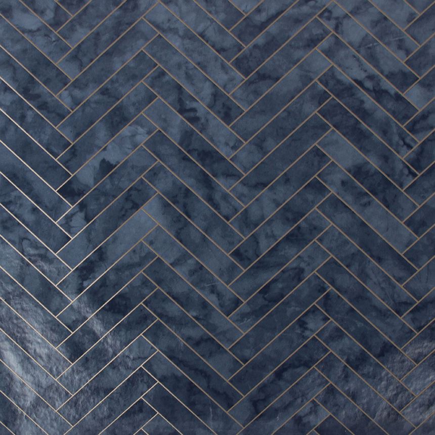 Geometrická kuchyňská a koupelnová vliesová tapeta s vinylovým povrchem, tmavě modrá mramor.